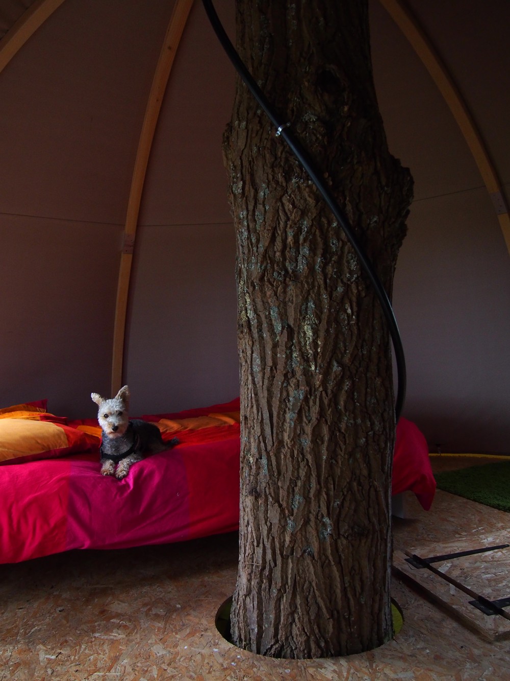 How cool is that?! Włazisz po drabinie (albo w wersji ekstremalnej po pomoście ze sznurów), otwierasz klapę i wchodzisz do idelanego pokoiku z drewnianym łóżkiem i dorodnym pniem drzewa po środku. Dookoła cisza i szum liści, a w nocy kompletna ciemnica. Przy zameldowaniu dostajesz czołówkę, żebyś mogła sobie poczytać po zmroku i nie zabić się w drodze do kibelka w nocy. Z psem możesz spać na luzie, o ile dasz radę go wnieść. Jeśli nie, podobne iglo czeka na Ciebie również na parterze.. Takie cuda tylko na Tree camp Etretat Aventure.
