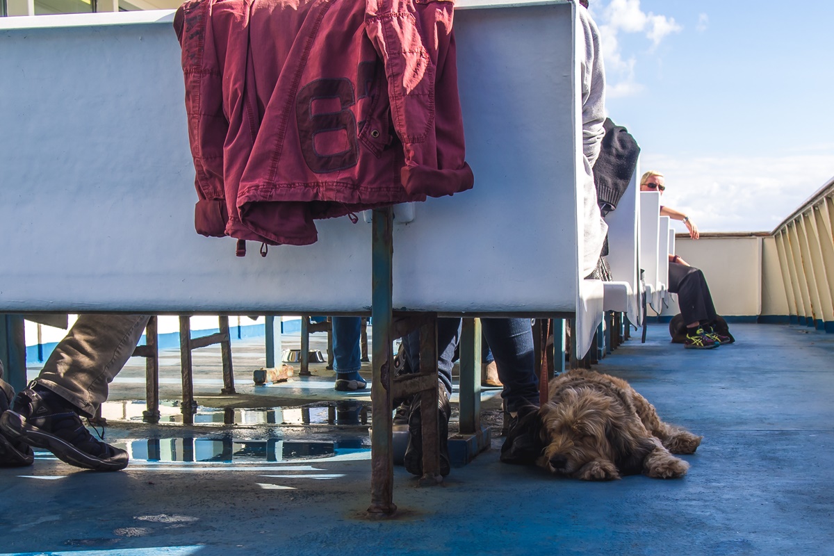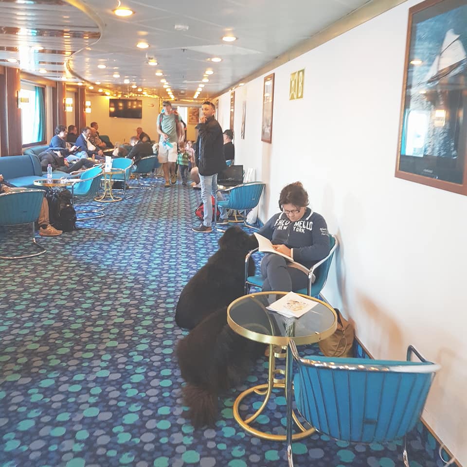 Zarówno w trakcie przeprawy Viking Line do Helsinek, jak i Corsica Ferries do Bastii na Korysce mogliśmy z Lu siedzieć wszędzie, poza małą częścią eleganckiej restauracji (takiej z nakrytymi stołami). Zajmowaliśmy więc miejsce w jakimś cichym kąciku, rozkładaliśmy kocyk, albo matę, zamawialiśmy kawę, albo coś do jedzenia w barze i… zabieraliśmy sie za czytanie i spanie. Na takich dużych promach nie buja i cała podróż z reguły mija cicho i przyjemnie. Warto pamiętać, żeby szukać miejsce z daleka od samego baru, od automatów do gry i sceny (jeśli taka jest), na której szczególnie w weekend mogą odbywać się koncerty. Gdy płynęliśmy na Korsykę dużo osób z psami siedziało na zewnątrz, na najwyższym pokładzie, bo pogoda była naprawdę piękna. Tu tez oczywiście zawsze obowiązuje smycz.