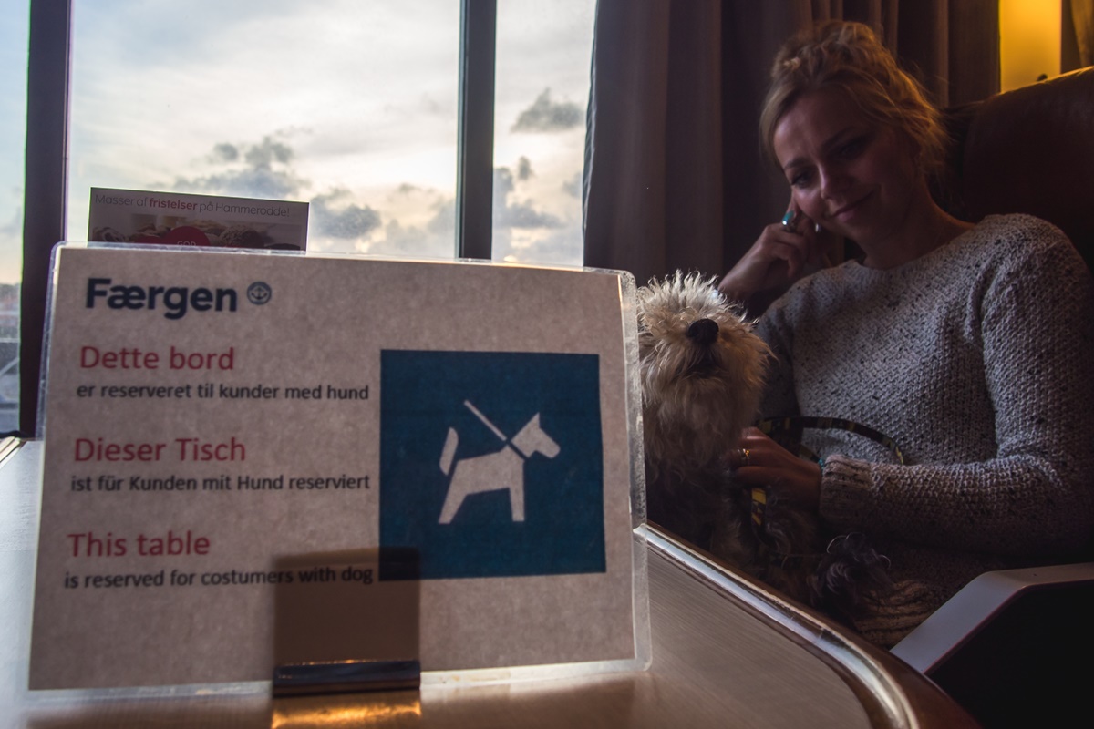 Z Sassnitz (na Rugii) do Ronne (na Bornholmie) płynęliśmy ok. 4h. Dla pasażerów podróżujących z psami na promie została wydzielona część jednej, dużej sali.  Gdy płynęliśmy na Bornholm było tam prawie pusto, gdy wracaliśmy wszystkie miejsca siedzące były zajęte. Niektórzy pasażerowie musieli więc rozłożyć bazę na podłodze w korytarzach. Dlatego wybierając się na ten prom warto wcześniej ruszyć na chcek-in, żeby zając sobie wygodne miejsce na fotelu. Na spacery można chodzić na pokład zewnętrzny – oczywiście zawsze na smyczy.