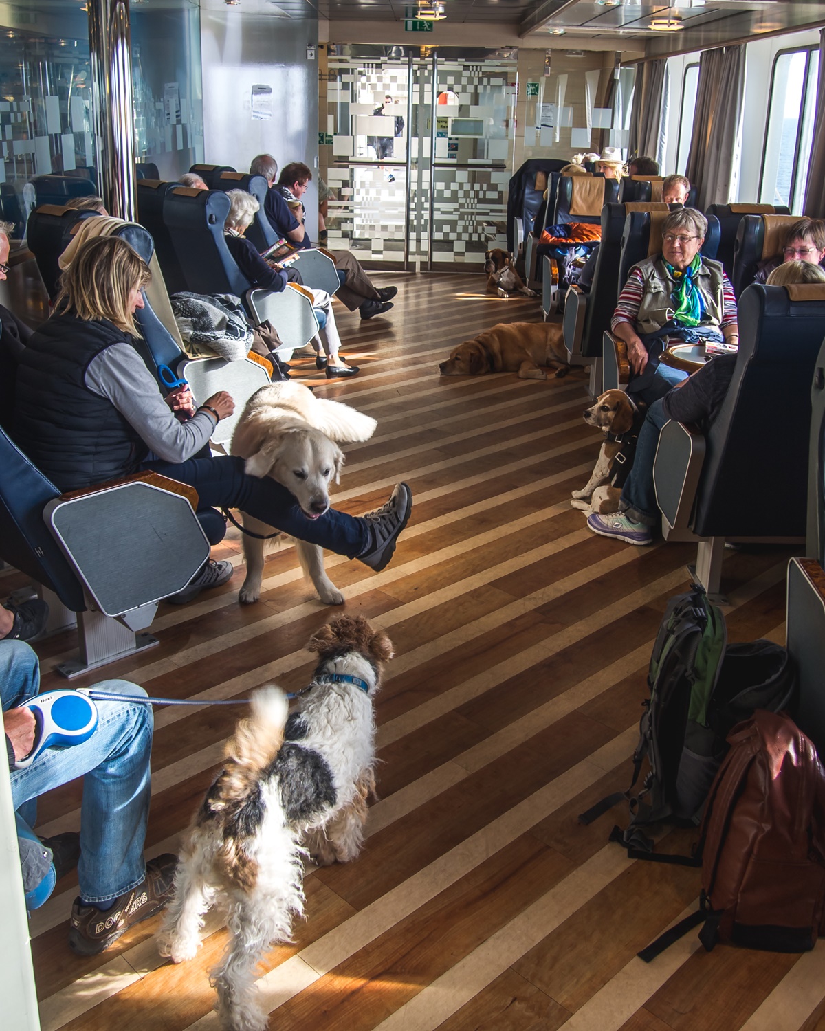 No i last but not least – czy psiaki się stresują? Po Lu nigdy nie widziałam stresu. Nie lubi chaotycznego momentu parkowanie i wysypywanie z samochodów w garażach, a potem dreptania na górę (uwaga na łapy!) i ponownego ładowania się do samochodu, gdy prom zbliża się do celu. Ale to trwa zaledwie kilka minut. W trakcie przeprawy z reguły śpi. Inne psiaki również, a w trakcie przepraw widziałam najróżniejszych pływających psich podróżnych – w tym nawet trzyosobową rodzinę z 4 nowofundlandczykami.