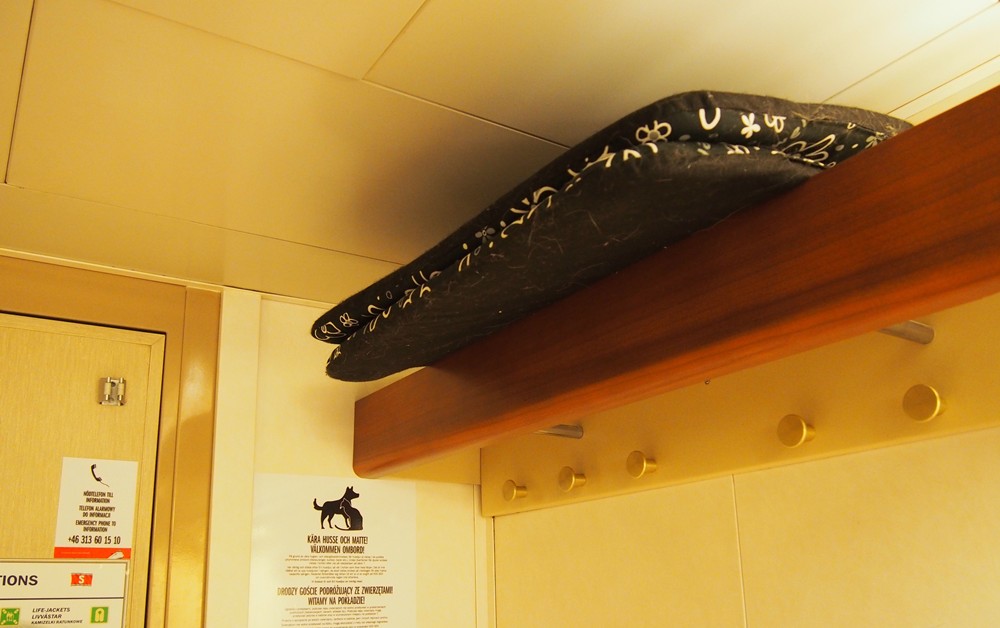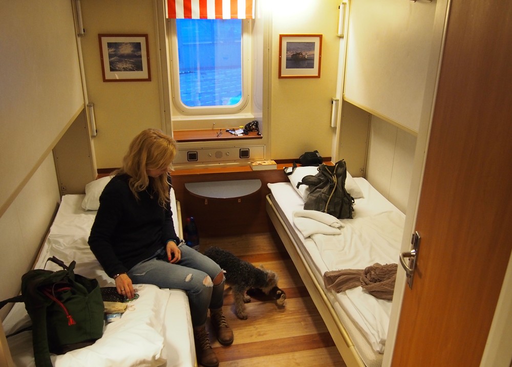 Na najdłuższą, 10-godzinną przeprawę z Gdyni do Karlskrony (Stena Line) pasażerowie podróżujący z psami (albo kotami) zobowiązani są wykupić kajutę. I chwała za ten przepis! Zdecydowaliśmy na rejs nocny i cała drogę po prostu przespaliśmy. W kajucie były dwa łózka, telewizor i mini-łazienka z prysznicem i ubikacją. Do tego duże posłanie dla psa i dwie miski. W nocy na morzu było cicho i przyjemnie, Lu chrapała na plecach całe 8h.