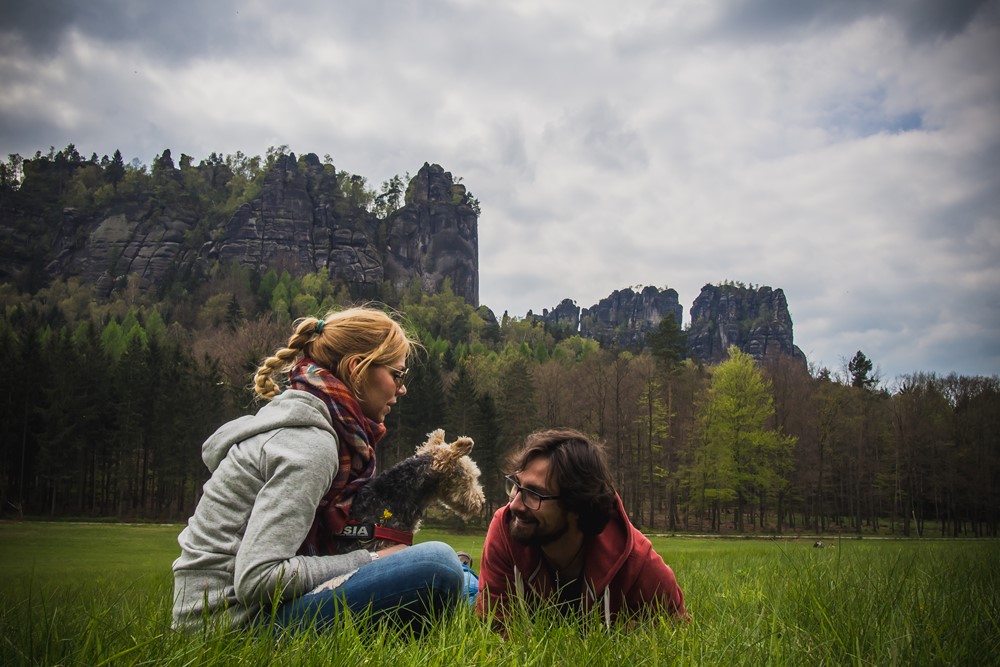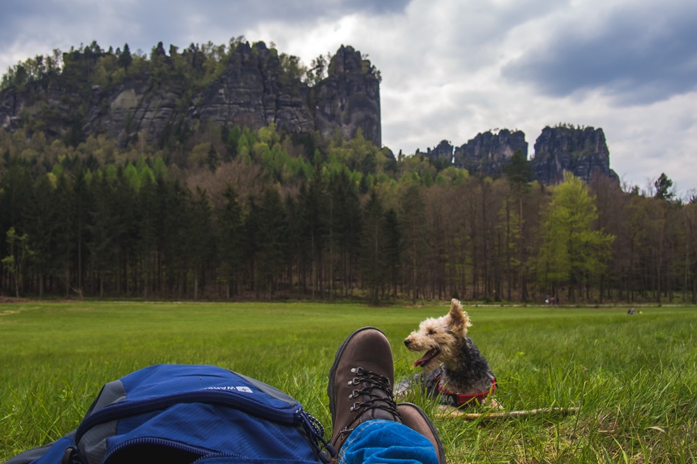 Nie dość, że po parku możesz bez problemu wędrować z czworonogiem na smyczy, to jeszcze dobrzy ludzie sprawdzili, gdzie będzie Wam najwygodniej i najprzyjemniej dla łap. Wybieramy szlak na dziką polanę (Wildwiese) z widokiem na grupę skalną Schrammsteine – 3,8 km w jedną stronę i ok. 107 m przewyższeń.