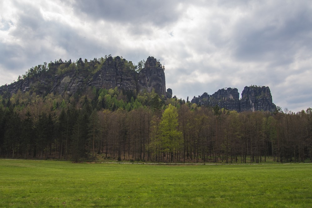 Po krótkim marszu, którego końcówka pnie się stromo pod górę wychodzimy na soczyście zieloną polanę. Na tej polanie 28 kwietnia 1991 świętowano otwarcie Parku Narodowego Saskiej Szwajcarii. Czasami, oprócz psiarzy, ściągają tu też fotografowie poszukujący sokoła wędrownego, który od ’92 ponownie osiedlił się w skalnych zakamarkach.